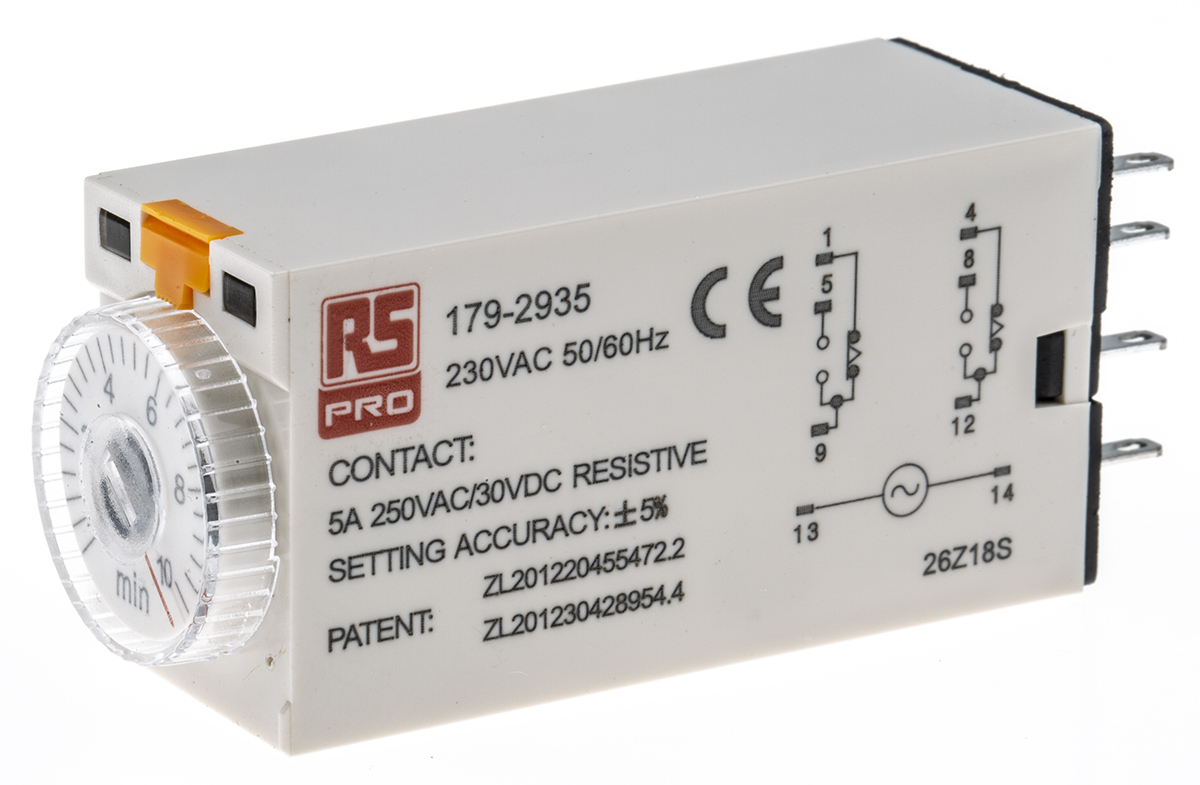 This is Analogue Time Relay. 8 pin DPCO manufactured by RS PRO. The manufacturer part number is 179-2935. The product is available in plug in configuration. Its accurate length is 53mm. Furthermore, the product is 21.5mm wide. The product comes in 2.8mm depth. The product contains 2 contacts. The terminal is a 8-pin connector type.