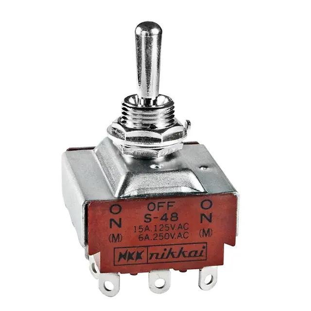 This is manufactured by NKK Switches. The manufacturer part number is S48. It is assigned with possible HTSUS value of 8536.50.9065. The product is rohs3 compliant. The product offers long-lasting services of 25,000 cycles. Moreover, it has solder lug terminal style. 30 v of DC voltage rating. The product has -10°c ~ 70°c operating temperature range. It also has a circular - 12.50mm dia dimensional features. The actuator is a 17.50mm long. The product exhibits 125 v of AC voltage rating. In addition, it is reach unaffected. It is shipped in bulk. It is designed as a mom-off-mom switching function. Its typical moisture sensitivity level is 1 (unlimited). It has an integral 4pdt circuit. It has a long 52 weeks standard lead time. Additionally, the product's output is 15a (ac), 20a (dc) The product is available in panel mount configuration. The product s, is a highly preferred choice for users. The product has bushing thread of m12 x 1. The product carries standard round actuator. Is this product illuminated? non-illuminated. The actuator is designed from sturdy brass, chrome plated material. The product is designated with the ear99 code number