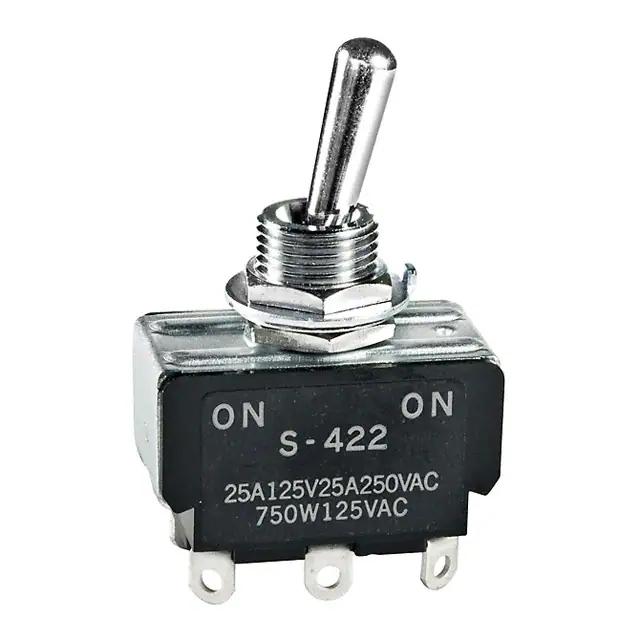 This is manufactured by NKK Switches. The manufacturer part number is S422. It features a 10mω contact resistance. The actuator is a 17.5mm long. The product is available in panel mount configuration. Moreover, the product has a nominal 125v ac voltage rating. The actuator is designed from sturdy chrome plated brass material. Whereas, the minimum operating temperature of the product is -10°c. The product also provide mechanical stability with 50000operations. It has a maximum operating temperature of +70°c. The terminal is a solder type. It is assigned with possible HTSUS value of 8536.50.9065. The product is rohs3 compliant. The product offers long-lasting services of 15,000 cycles. Moreover, it has solder lug terminal style. The product has -10°c ~ 70°c operating temperature range. It also has a circular - 12.50mm dia dimensional features. The actuator is a 17.50mm long. The product exhibits 125 v of AC voltage rating. In addition, it is reach unaffected. It is shipped in bulk. It is designed as a on-on switching function. Its typical moisture sensitivity level is 1 (unlimited). It has an integral dpdt circuit. It has a long 30 weeks standard lead time. Additionally, the product's output is 25a (ac) The product s400, is a highly preferred choice for users. The product has bushing thread of m12 x 1. The product carries standard round actuator. Is this product illuminated? non-illuminated. The actuator is designed from sturdy brass, chrome plated material. The product is designated with the ear99 code number