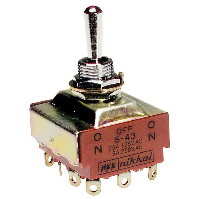 This is manufactured by NKK Switches. The manufacturer part number is S43. It features a 10mω contact resistance. The actuator is a 17.5mm long. The product is available in panel mount configuration. Moreover, the product has a nominal 30 v dc, 250 v ac voltage rating. The actuator is designed from sturdy chrome plated brass material. Whereas, the minimum operating temperature of the product is -10°c. The product also provide mechanical stability with 50000operations. It has a maximum operating temperature of +70°c. The terminal is a solder lug type. The product is made from sturdy brass materials. It is assigned with possible HTSUS value of 8536.50.9065. The product is rohs3 compliant. The product offers long-lasting services of 25,000 cycles. Moreover, it has solder lug terminal style. 30 v of DC voltage rating. The product has -10°c ~ 70°c operating temperature range. It also has a circular - 12.50mm dia dimensional features. The actuator is a 17.50mm long. The product exhibits 125 v of AC voltage rating. In addition, it is reach unaffected. It is shipped in bulk. It is designed as a on-off-on switching function. Its typical moisture sensitivity level is 1 (unlimited). It has an integral 4pdt circuit. It has a long 52 weeks standard lead time. Additionally, the product's output is 20a (ac/dc) The product s, is a highly preferred choice for users. The product has bushing thread of m12 x 1. The product carries standard round actuator. Is this product illuminated? non-illuminated. The actuator is designed from sturdy brass, chrome plated material. The product is designated with the ear99 code number