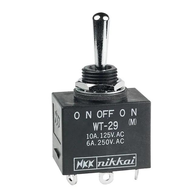 This is manufactured by NKK Switches. The manufacturer part number is WT29S. It is assigned with possible HTSUS value of 8536.50.9065. The product is rohs3 compliant. The product offers long-lasting services of 15,000 cycles. Moreover, it has solder lug terminal style. 30 v of DC voltage rating. The product has -30°c ~ 70°c operating temperature range. It also has a circular - 12.50mm dia dimensional features. The actuator is a 17.50mm long. The product exhibits 125 v of AC voltage rating. In addition, it is reach unaffected. It is shipped in bulk. It is designed as a on-off-mom switching function. Its typical moisture sensitivity level is 1 (unlimited). It has an integral dpdt circuit. It has a long 20 weeks standard lead time. Additionally, the product's output is 10a (ac/dc) It is IP rated with ip67 - dust tight, waterproof. The splendid features of the product include epoxy sealed terminals. The product is available in panel mount configuration. The product wt, is a highly preferred choice for users. The product has bushing thread of m12 x 1. The product carries standard round actuator. Is this product illuminated? non-illuminated. The actuator is designed from sturdy brass, chrome plated material. The product is designated with the ear99 code number