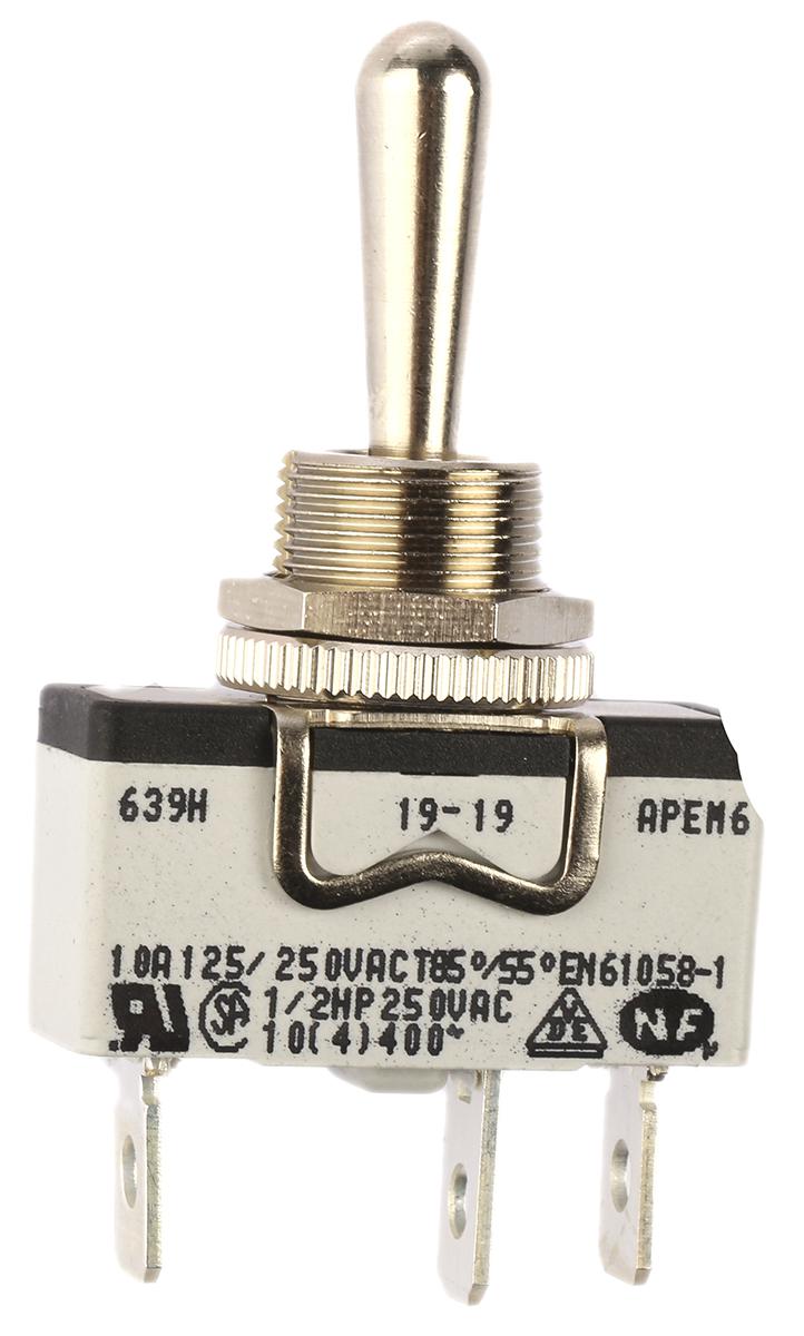 This is Apem SP Toggle Switch On-Off-On Panel Mount manufactured by APEM. The manufacturer part number is 639H/2. It features a 0.01ω contact resistance. The actuator is a 17.5mm long. The product is available in panel mount configuration. The actuator is designed from sturdy nickel plated brass material. Whereas, the minimum operating temperature of the product is -20°c. The product is made from sturdy silver nickel alloy materials. It has a maximum operating temperature of +55°c. The terminal is a tab type.