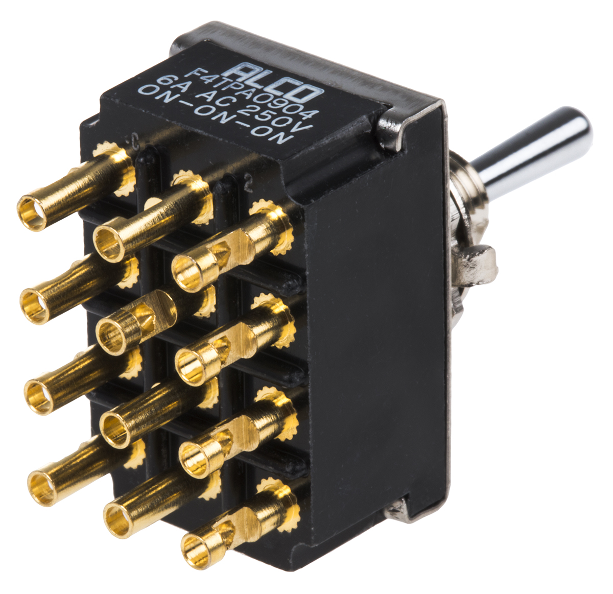 This is 4PDT Toggle Switch On-On-On manufactured by TE Connectivity. The manufacturer part number is F4TPA0904. It features a 10mω contact resistance. The actuator is a 10.5mm long. The product is available in panel mount configuration. Moreover, the product has a nominal 125 v ac, 250v ac voltage rating. Whereas, the minimum operating temperature of the product is -20°c. The product also provide mechanical stability with 100000operations. It has a maximum operating temperature of +70°c. The terminal is a solder type. The product is made from sturdy fine silver materials.