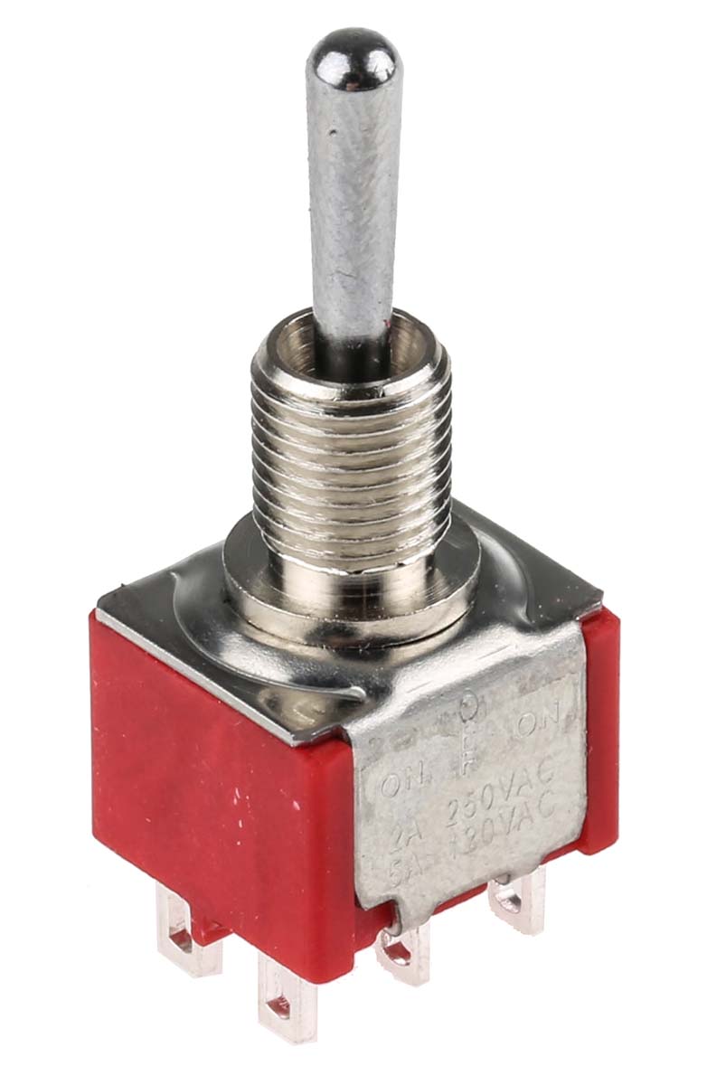 This is DPDT Toggle Switch On-Off-On Panel Mount manufactured by RS Pro. The manufacturer part number is 448-0775. It features a 0.01ω contact resistance. The actuator is a 10.41mm long. The product is available in panel mount configuration. The actuator is designed from sturdy chromium plated brass material. Whereas, the minimum operating temperature of the product is -30°c. It has a maximum operating temperature of +85°c. The terminal is a solder type. The product is made from sturdy silver plated brass (movable) materials.