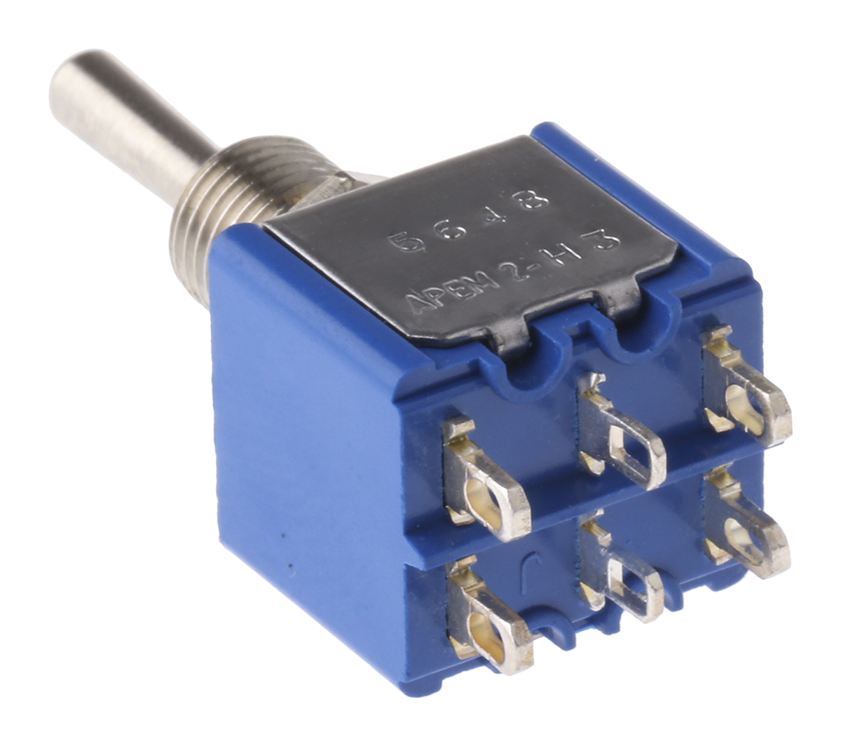 This is Apem DP Toggle Switch (On)-Off-On Panel Mount manufactured by APEM. The manufacturer part number is 5648A. It features a 0.01ω contact resistance. The product is available in panel mount configuration. The actuator is designed from sturdy brass material. Whereas, the minimum operating temperature of the product is -40°c. The product also provide mechanical stability with 100000operations. The product is made from sturdy silver materials. It has a maximum operating temperature of +85°c. The terminal is a solder type.