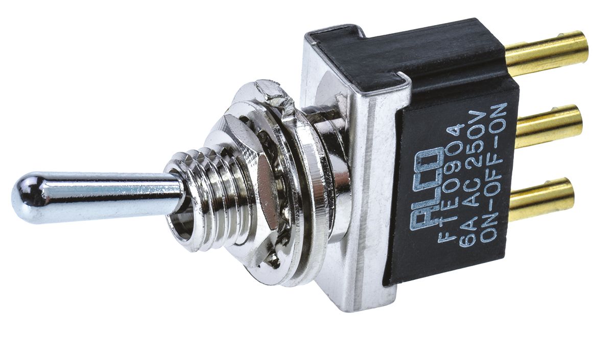 This is SPDT Toggle Switch On-Off-On Panel Mount manufactured by TE Connectivity. The manufacturer part number is FTE0904. It features a 0.01ω contact resistance. The actuator is a 10.5mm long. The product is available in panel mount configuration. Moreover, the product has a nominal 250v voltage rating. The actuator is designed from sturdy chrome plated brass material. Whereas, the minimum operating temperature of the product is -20°c. The product also provide mechanical stability with 100000operations. It has a maximum operating temperature of +80°c. The terminal is a solder type. The product is made from sturdy fine silver materials.