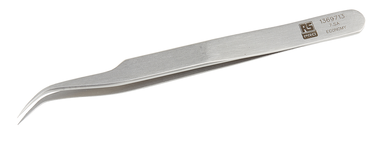 This is 115 mm Anti-Magnetic Stainless Steel Fine; Curved Anti-Acid Tweezers manufactured by RS Pro. The manufacturer part number is 136-9713. The product has a curved orientation. The product is made from highly stable and reliable stainless steel.