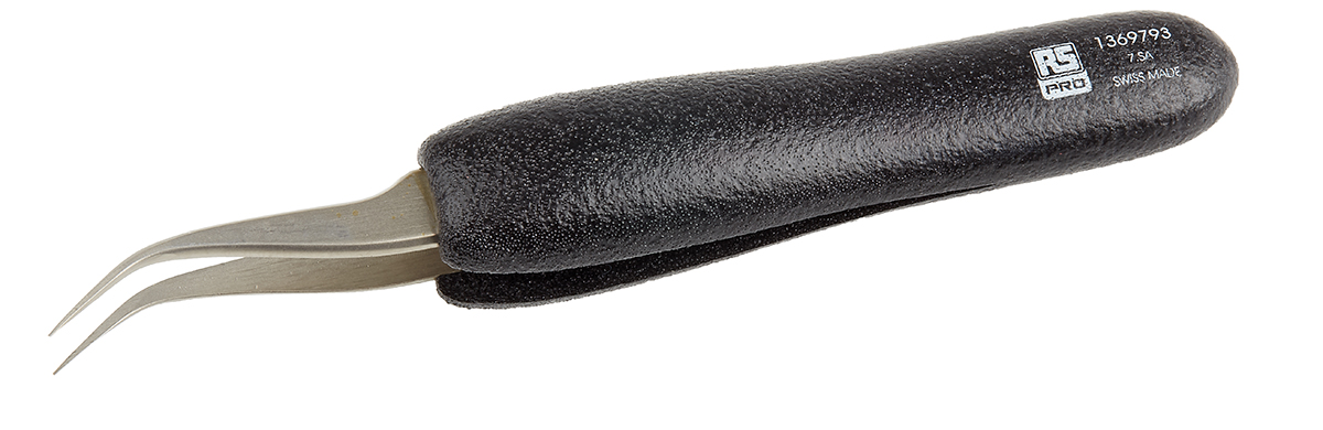 This is 120 mm Anti-Magnetic Stainless Steel Curved Fine ESD Anti-Acid Tweezers manufactured by RS Pro. The manufacturer part number is 136-9793. The product has a curved orientation. The product is made from highly stable and reliable stainless steel.