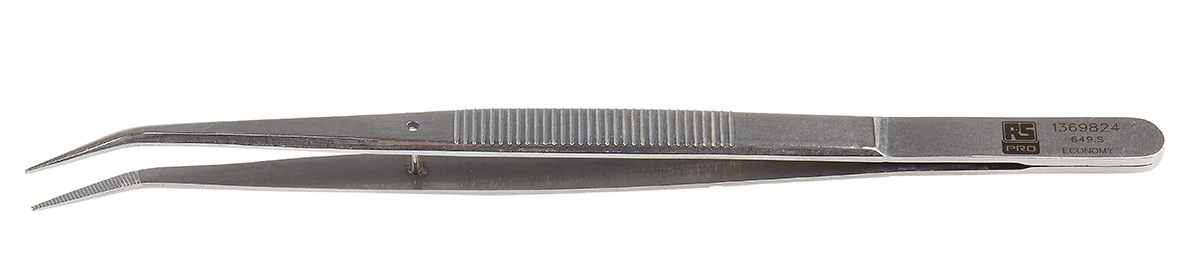 This is 155 mm Stainless Steel Fine; Serrated; Bent Anti-Acid Tweezers manufactured by RS Pro. The manufacturer part number is 136-9824. The product has a bent orientation. The product is made from highly stable and reliable stainless steel.