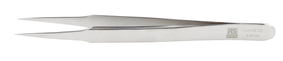 This is 120 mm Anti-Magnetic Stainless Steel Flat Anti-Acid Tweezers manufactured by RS Pro. The manufacturer part number is 136-9838. The product is made from highly stable and reliable stainless steel.
