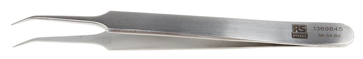 This is 110 mm Anti-Magnetic Stainless Steel Bent; Fine Anti-Acid Tweezers manufactured by RS Pro. The manufacturer part number is 136-9845. The product has a bent orientation. The product is made from highly stable and reliable stainless steel.