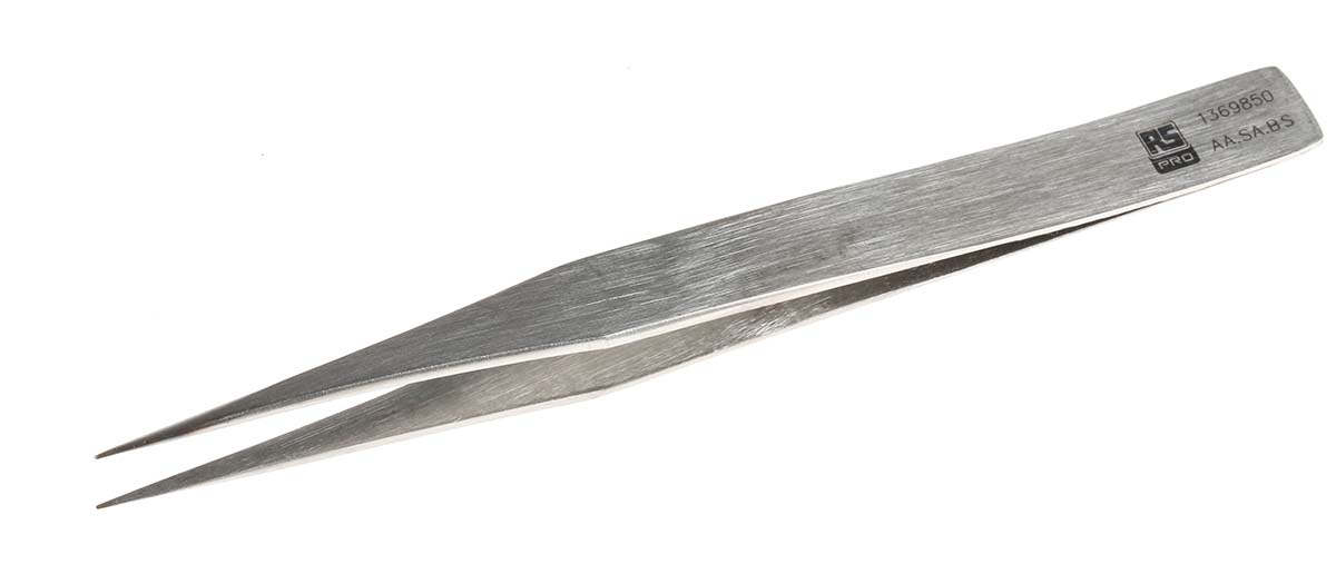 This is 130 mm Anti-Magnetic Stainless Steel Straight Fine Anti-Acid Tweezers manufactured by RS Pro. The manufacturer part number is 136-9850. The product has a straight orientation. The product is made from highly stable and reliable stainless steel.