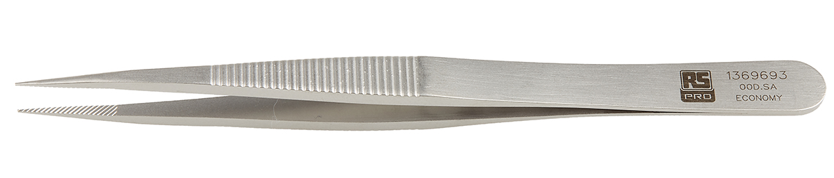 This is 120 mm Anti-Magnetic Stainless Steel Serrated Anti-Acid Tweezers manufactured by RS Pro. The manufacturer part number is 136-9693. The product is made from highly stable and reliable stainless steel.