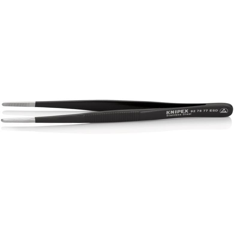 This is PRÄZISIONS-PINZETTE ESD manufactured by Knipex. The manufacturer part number is 92 78 77 ESD. The product has a straight orientation. The product is made from highly stable and reliable stainless steel.