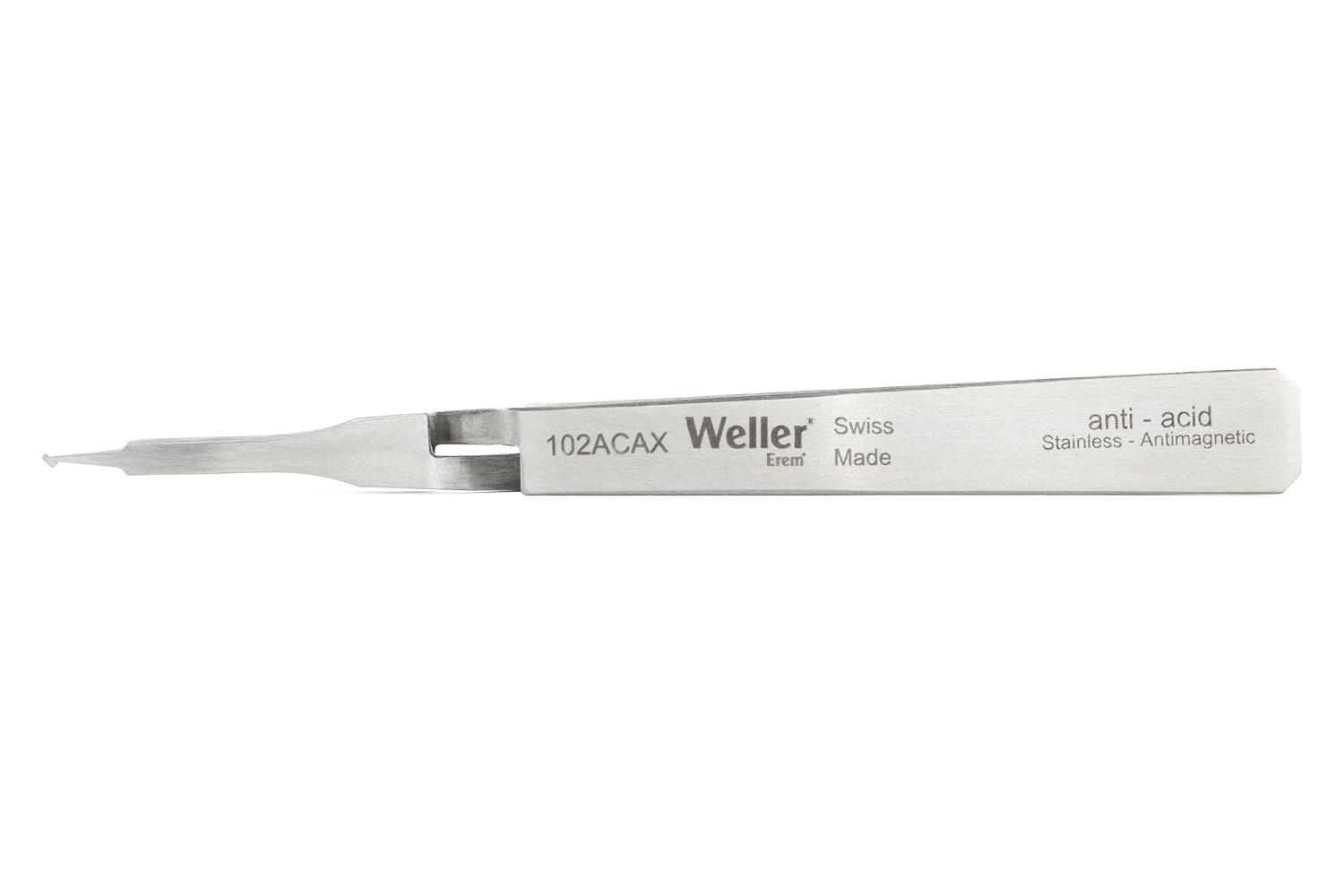 This is Erem by Weller 115 mm Anti-Magnetic Stainless Steel Bent Anti-Acid Tweezers manufactured by Weller Erem. The manufacturer part number is 102ACAX. The product is made from highly stable and reliable stainless steel. The product has a bent orientation.