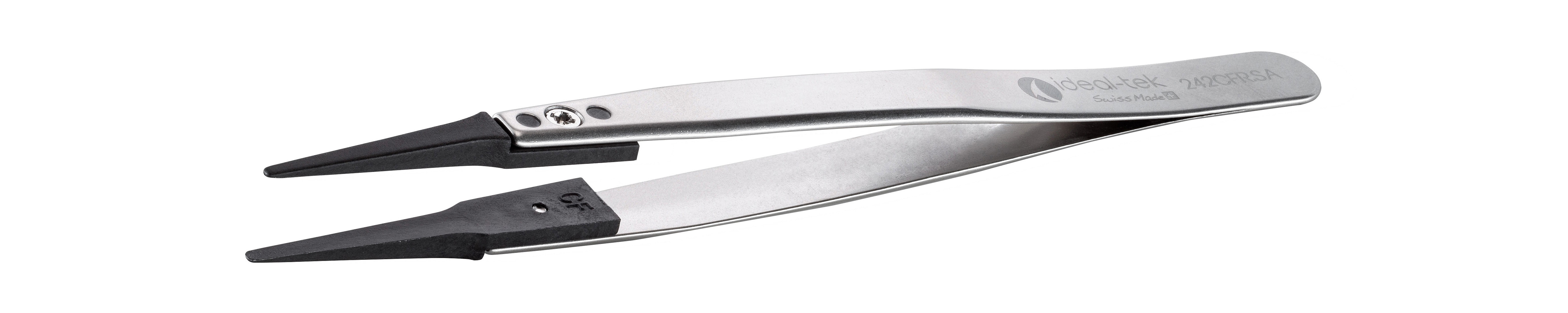 This is 130 mm PA66/CF30 (Tip) Stainless Steel (Body) Flat; Rounded ESD Tweezers manufactured by ideal-tek. The manufacturer part number is 242CFR.SA.1. The product is made from highly stable and reliable pa66/cf30 (tip), stainless steel (body).