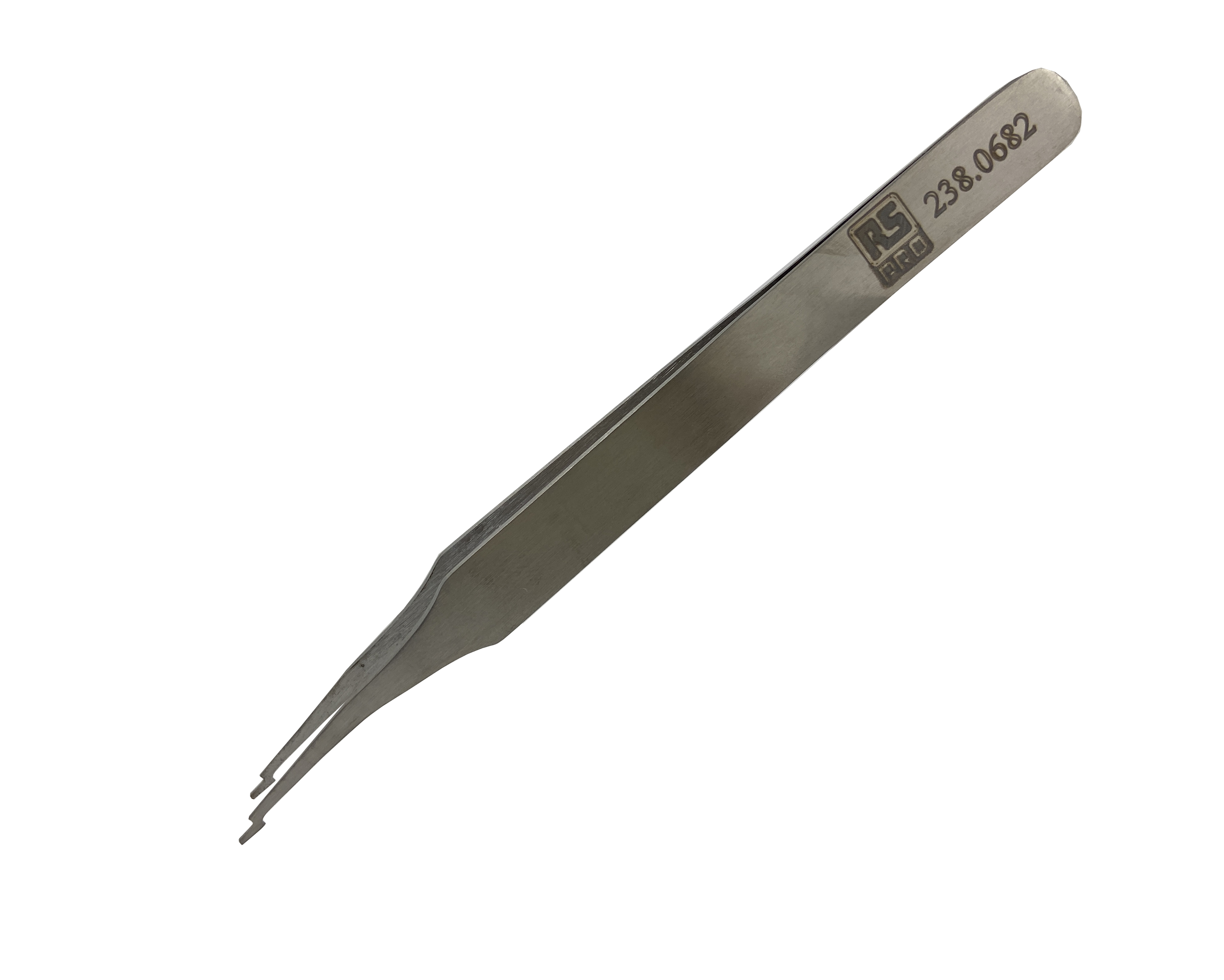 This is 120 mm Low Carbon Austenitic Steel Angle Tweezer manufactured by RS PRO. The manufacturer part number is 238-0682. The product is made from highly stable and reliable low carbon austenitic steel.