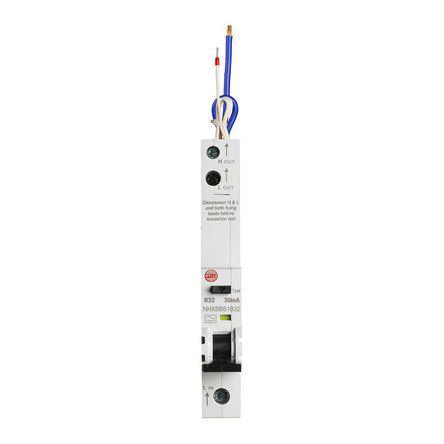 This is 1P 32 A RCBO DIN Rail Mount Trip Sensitivity 30mA manufactured by Wylex. The manufacturer part number is NHXSBS1B32.