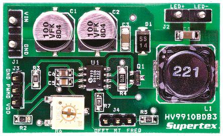 This is Supertex LED Driver Evaluation Board for HV9910 manufactured by Microchip. The manufacturer part number is HV9910BDB3.