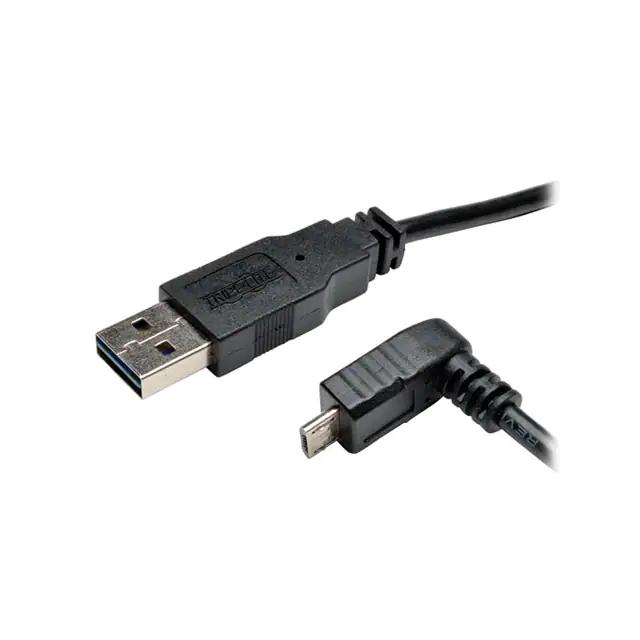 This is manufactured by Tripp Lite. The manufacturer part number is UR050-003-DNB. It is assigned with possible HTSUS value of 8544.42.2000. The product is rohs compliant. Specifications include usb 2.0. The product is available in a male to micro b male, down angle configuration. It is shipped in bulk. Moreover, the product has a wire gauge of 28 awg, 28 awg. Its typical moisture sensitivity level is not applicable. Its accurate length is 3.00' (914.4mm). The splendid features of the product include data transfer and charge, reversible. It has a classic black colour. The product is designated with the ear99 code number