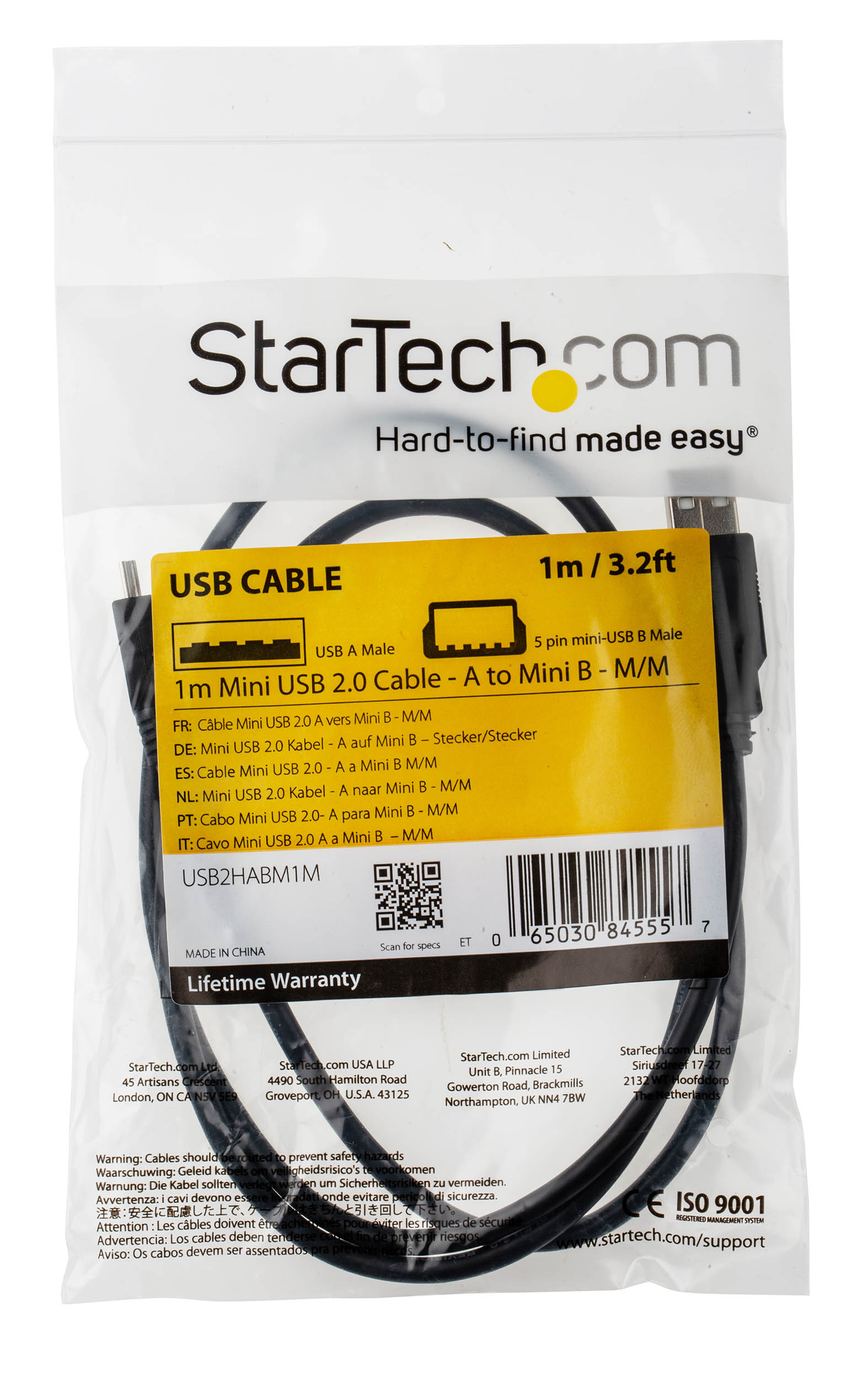 This is Male USB A to Male USB Mini B USB Cable 1m USB A USB Mini-B manufactured by StarTech.com. The manufacturer part number is USB2HABM1M. Its accurate length is 1m.