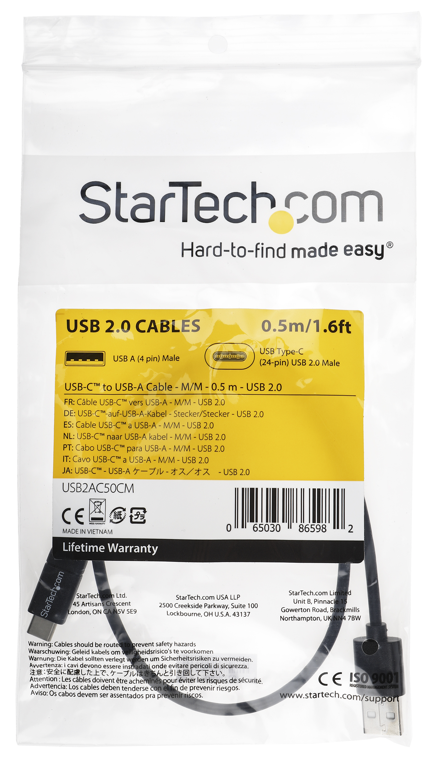 This is Male USB C to Male USB A USB Cable 0.5m USB A USB C manufactured by StarTech.com. The manufacturer part number is USB2AC50CM. Its accurate length is 0.5m.