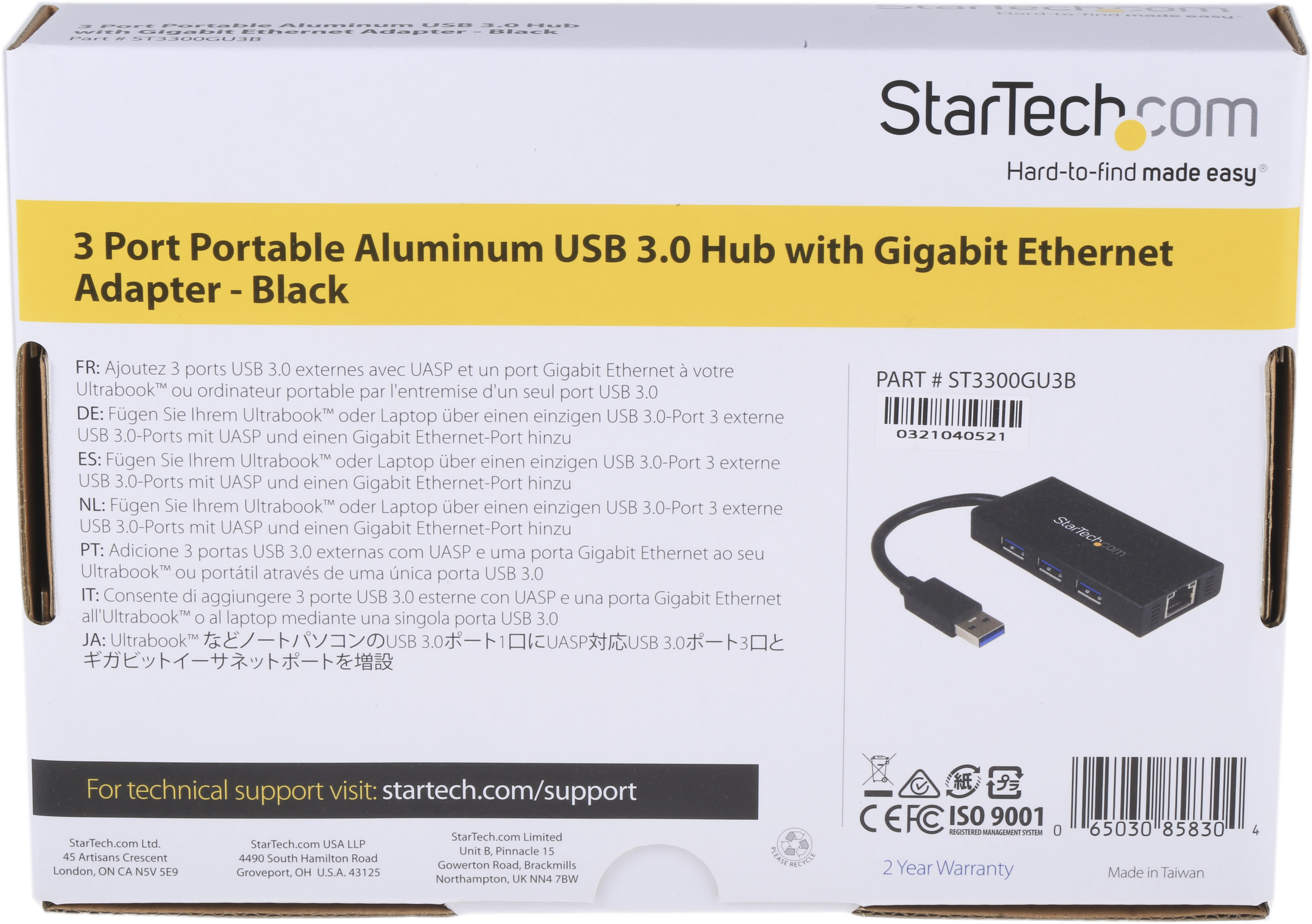 This is Startech 3x USB A Port Hub USB 3.0 - AC Adapter Powered manufactured by StarTech.com. The manufacturer part number is ST3300GU3B. The given dimensions of the product include 87 x 43 x 14mm. In addition, the height is 14mm. Furthermore, the product is 87mm wide. The product comes in 43mm depth.
