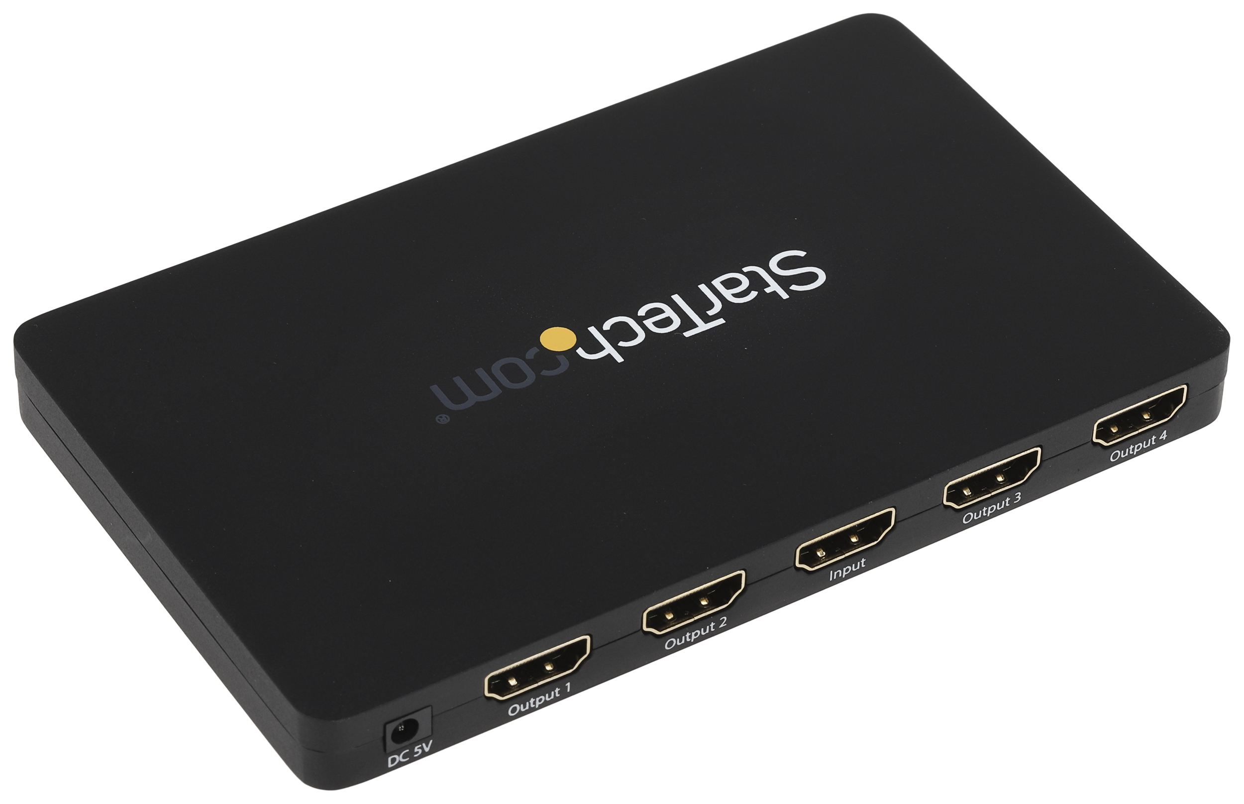 This is HDMI Splitter Ultra HD 1 in 4 out manufactured by StarTech.com. The manufacturer part number is ST124HD4K. The given dimensions of the product include 139 x 84 x 14mm. The typical product's weight is 277g. This product features 4 number of ports. In addition, the height is 14mm. Furthermore, the product is 139mm wide. The product comes in 84mm depth.