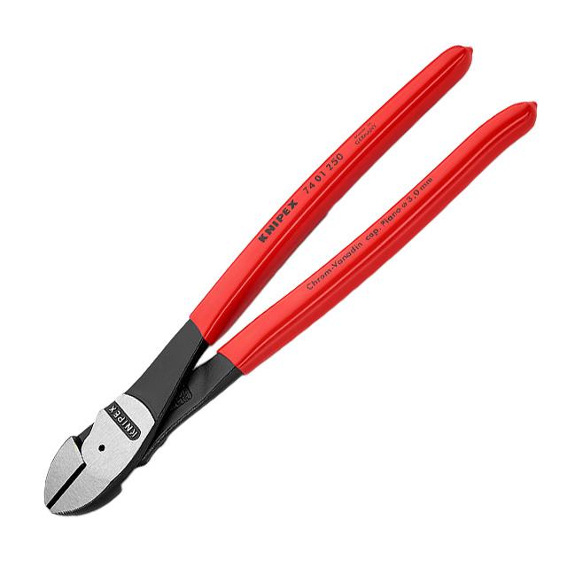 This is manufactured by Knipex Tools LP. The manufacturer part number is 74 01 250. The product has an integral 9.84" (250.0mm) overall length. The splendid features of the product include high leverage. It is assigned with possible HTSUS value of 8203.20.6060. It is shipped in bulk. It is a angled product with unique specifications. Its typical moisture sensitivity level is 1 (unlimited). In addition, it is vendor undefined. It comes in side (diagonal) configuration. The product is designated with the ear99 code number