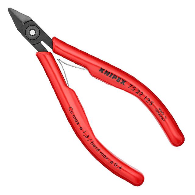 This is manufactured by Knipex Tools LP. The manufacturer part number is 75 22 125. The product has an integral 5.00" (127.0mm) overall length. The module has the capacity of 0.4mm dia hard wire, 0.8mm dia medium wire, 0.4mm dia piano wire, 0.4 ~ 1.2mm dia soft wire. It is assigned with possible HTSUS value of 8203.20.6060. It is shipped in bulk. It is a oval product with unique specifications. Its typical moisture sensitivity level is 1 (unlimited). In addition, it is vendor undefined. It comes in side (diagonal) configuration. The product is designated with the ear99 code number
