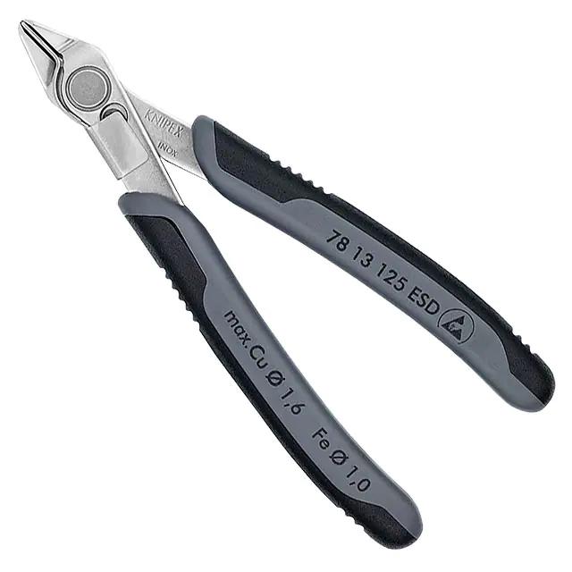 This is manufactured by Knipex Tools LP. The manufacturer part number is 78 13 125 ESD. The product has an integral 5.00" (127.0mm) overall length. The module has the capacity of 1.2mm dia medium wire, 0.4 ~ 1.6mm dia soft wire. The splendid features of the product include esd safe, soft grips. It is assigned with possible HTSUS value of 8203.20.6060. It is shipped in bulk. It is a oval product with unique specifications. Its typical moisture sensitivity level is 1 (unlimited). In addition, it is vendor undefined. It comes in side (diagonal) configuration. Moreover, it corresponds to 78 13, a base product number of the product. The product is designated with the ear99 code number
