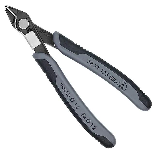 This is manufactured by Knipex Tools LP. The manufacturer part number is 78 71 125 ESD. The product has an integral 5.00" (127.0mm) overall length. The module has the capacity of 1.2mm dia medium wire, 0.4 ~ 1.6mm dia soft wire. The splendid features of the product include esd safe, soft grips. It is assigned with possible HTSUS value of 8203.20.6060. It is shipped in bulk. It is a oval product with unique specifications. Its typical moisture sensitivity level is 1 (unlimited). In addition, it is vendor undefined. It comes in side (diagonal) configuration. Moreover, it corresponds to 78 71, a base product number of the product. The product is designated with the ear99 code number