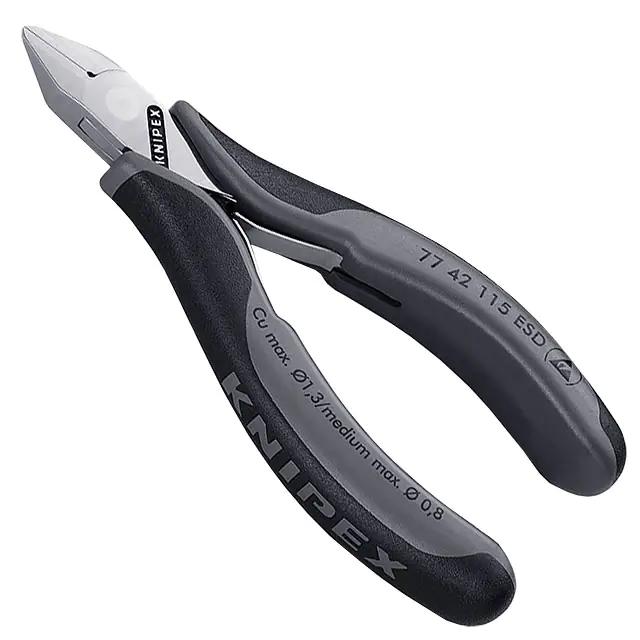 This is manufactured by Knipex Tools LP. The manufacturer part number is 77 42 115 ESD. The product has an integral 4.50" (114.3mm) overall length. The module has the capacity of 0.8mm dia medium wire, 0.4 ~ 1.2mm dia soft wire. The splendid features of the product include esd safe, soft grips. It is assigned with possible HTSUS value of 8203.20.6060. It is shipped in bulk. It is a oval product with unique specifications. Its typical moisture sensitivity level is 1 (unlimited). In addition, it is vendor undefined. It comes in side (diagonal) configuration. Moreover, it corresponds to 77 42, a base product number of the product. The product is designated with the ear99 code number