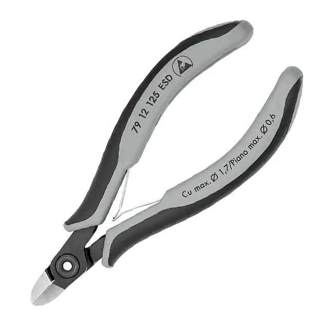 This is manufactured by Knipex Tools LP. The manufacturer part number is 79 12 125 ESD. The product has an integral 5.00" (127.0mm) overall length. The module has the capacity of 1.2mm dia hard wire, 1.2mm dia medium wire, 0.4mm dia piano wire, 0.4 ~ 2mm dia soft wire. The splendid features of the product include esd safe, soft grips. It is assigned with possible HTSUS value of 8203.20.6060. It is shipped in bulk. It is a oval product with unique specifications. Its typical moisture sensitivity level is 1 (unlimited). In addition, it is vendor undefined. It comes in side (diagonal) configuration. Moreover, it corresponds to 79 12, a base product number of the product. The product is designated with the ear99 code number