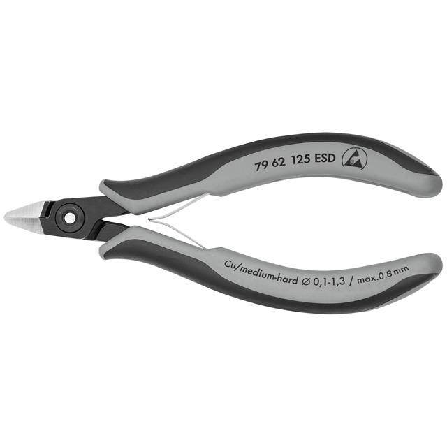 This is manufactured by Knipex Tools LP. The manufacturer part number is 79 62 125 ESD. The product has an integral 5.00" (127.0mm) overall length. The module has the capacity of 0.8mm dia medium wire, 0.4 ~ 1.6mm dia soft wire. The splendid features of the product include esd safe, soft grips. It is assigned with possible HTSUS value of 8203.20.6060. It is shipped in bulk. It is a oval product with unique specifications. Its typical moisture sensitivity level is 1 (unlimited). In addition, it is vendor undefined. It comes in side (diagonal) configuration. Moreover, it corresponds to 79 62, a base product number of the product. The product is designated with the ear99 code number