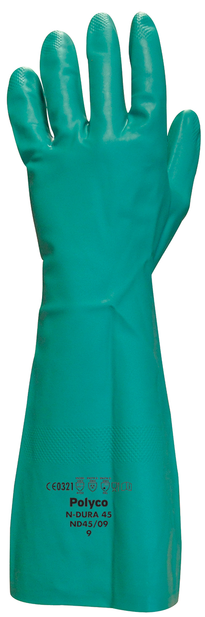 This is N-Dura Green Chemical Resistant Synthetic Polymer Nitrile-Coated Reusable Gloves 10 manufactured by BM Polyco. The manufacturer part number is ND45/10.