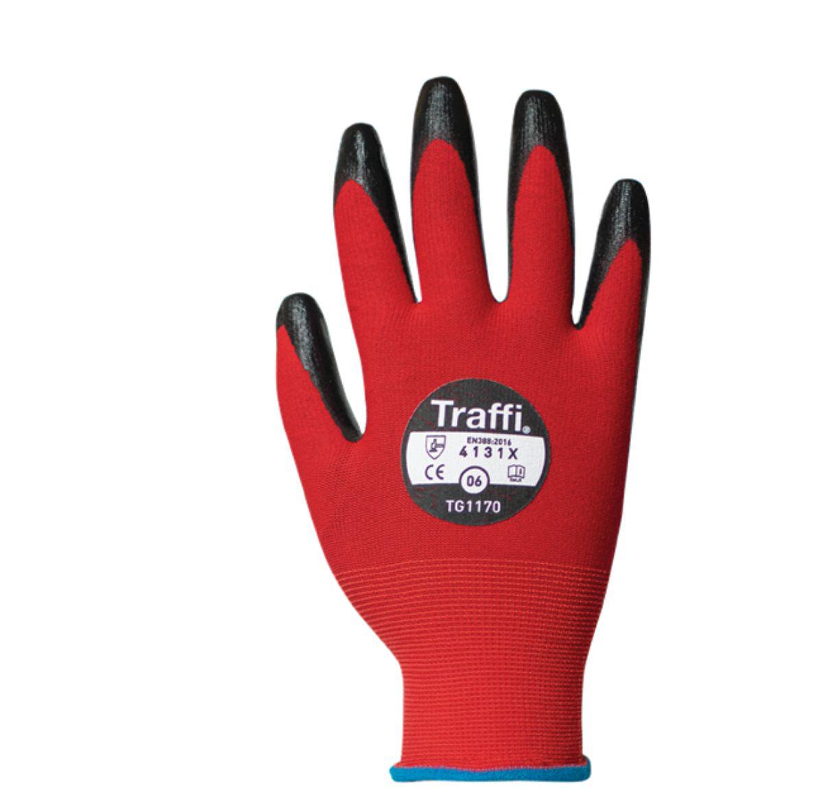 This is Red Nitrile Nylon Cut Resistant Cut Resistant Gloves Size 9 Nitrile Coating manufactured by Traffi. The manufacturer part number is TG1170-09.